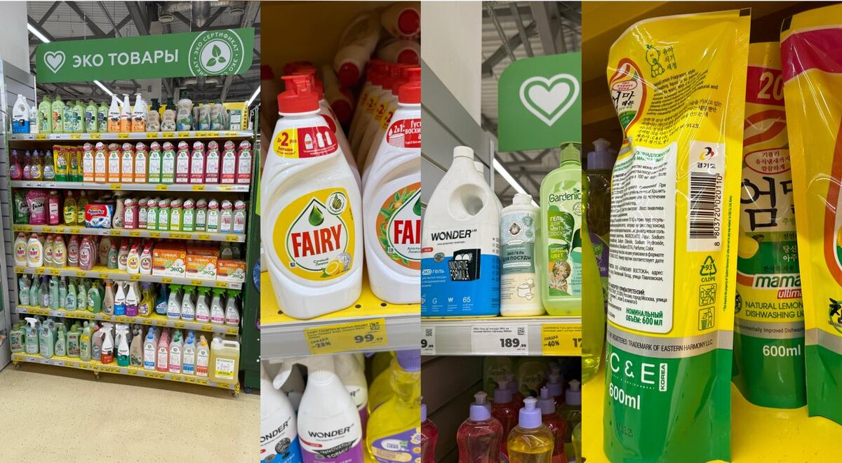 Экополки в супермаркетах похожи на обещания начать вести здоровый образ жизни с понедельника: звучит вдохновляюще, выглядит вполне серьёзно, но оказывается обычной формальностью для галочки. Вот я зашёл в “Магнит”, посмотреть на экополку. По замыслу, благодаря этой зоне, покупатель легко отличит экологичный товар от всего остального. А что по факту? Обычная полка. Вперемешку стоят и средства в неперерабатываемом «дойпаке», и Fairy без экологичных сертификатов, ещё и в «белом» ПЭТ-пластике, который также не перерабатывается, и Wonder в термоусадочной этикетке… короче, ни сертификатов, ни нормальной упаковки, ни логики. В итоге экополка — это просто выставка достижений маркетинга. Такой уголок иллюзий: “Вот тут могла бы быть ваша забота о природе, если бы на неё реально обращали внимание”.