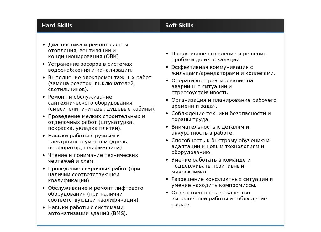 - Разделите навыки на категории: Например, "Сантехнические работы", "Электромонтажные работы", "Ремонтные работы", "Обслуживание инженерных систем", "Личные качества".