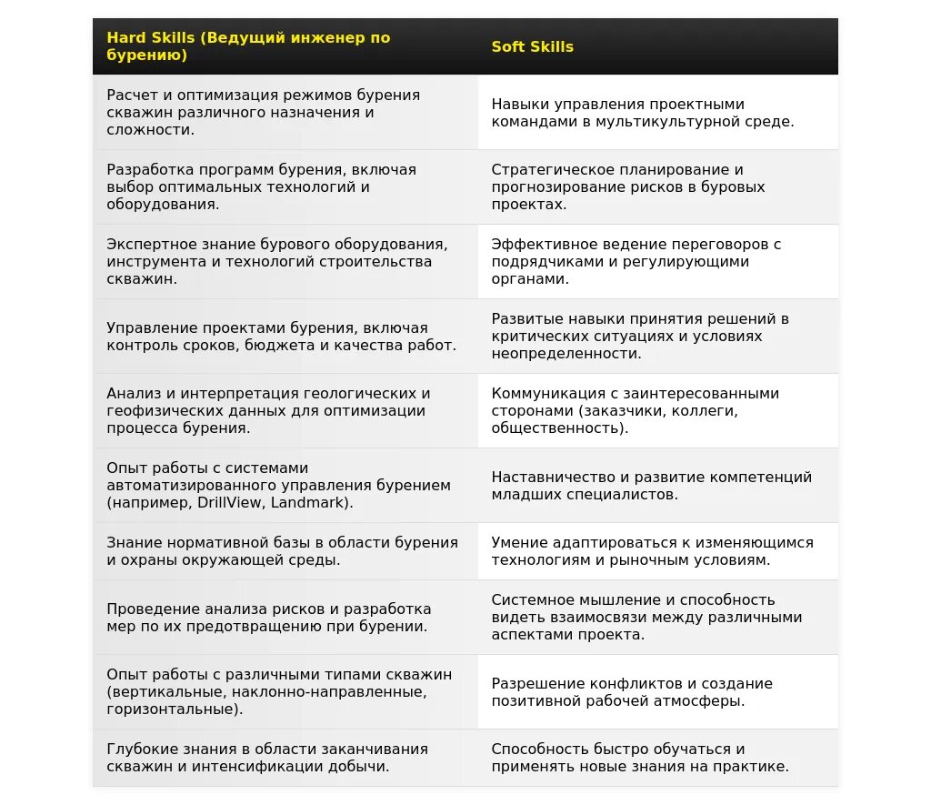 - На какие качества и навыки делать акцент: Ответственность, обучаемость, аналитические способности, знание специализированного ПО (например, Schlumberger DrillPlan, Landmark Compass), умение работать в команде.