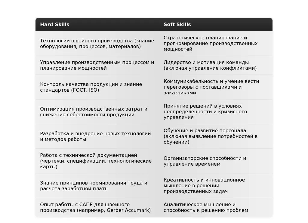 - На какие качества и навыки делать акцент: Знание технологий швейного производства, умение работать с технической документацией, внимательность к деталям, ответственность, умение работать в команде.