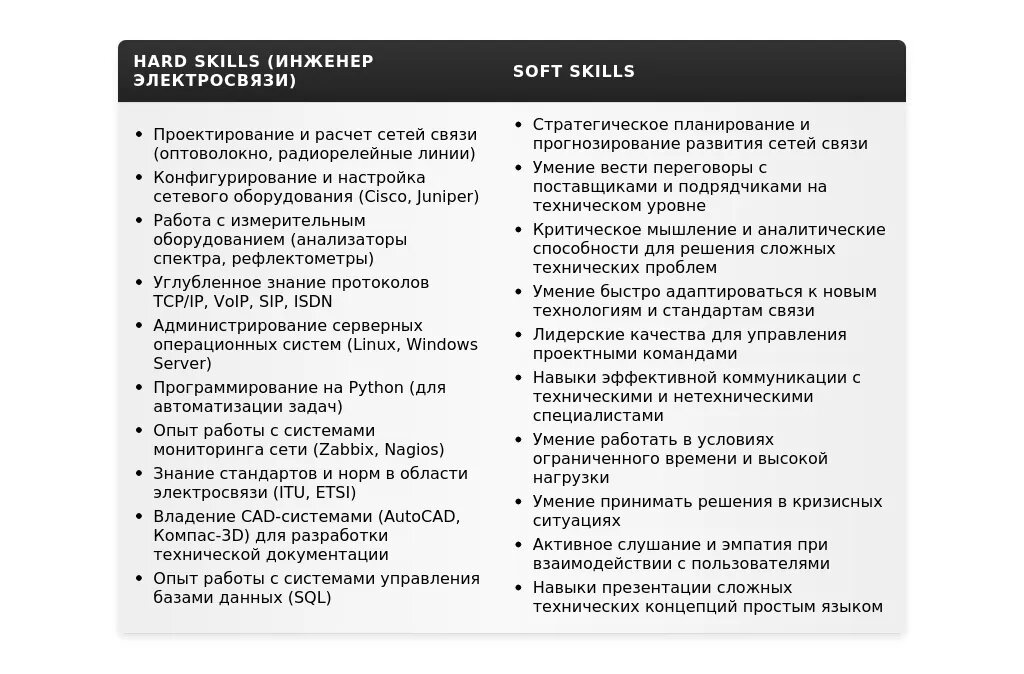 - Технические знания (протоколы, оборудование, стандарты связи).