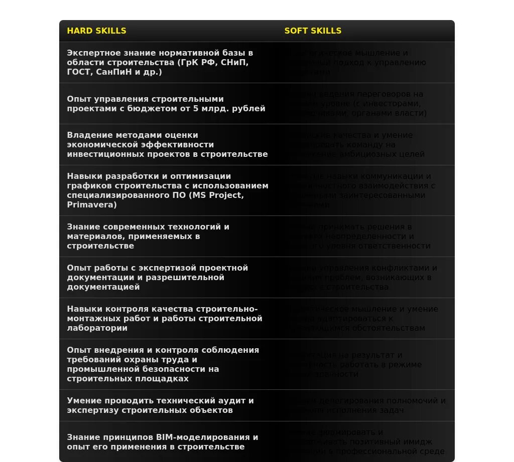 - Акцент на качества и навыки: Аналитические способности, организаторские навыки, умение работать в команде, знание нормативной базы в строительстве.