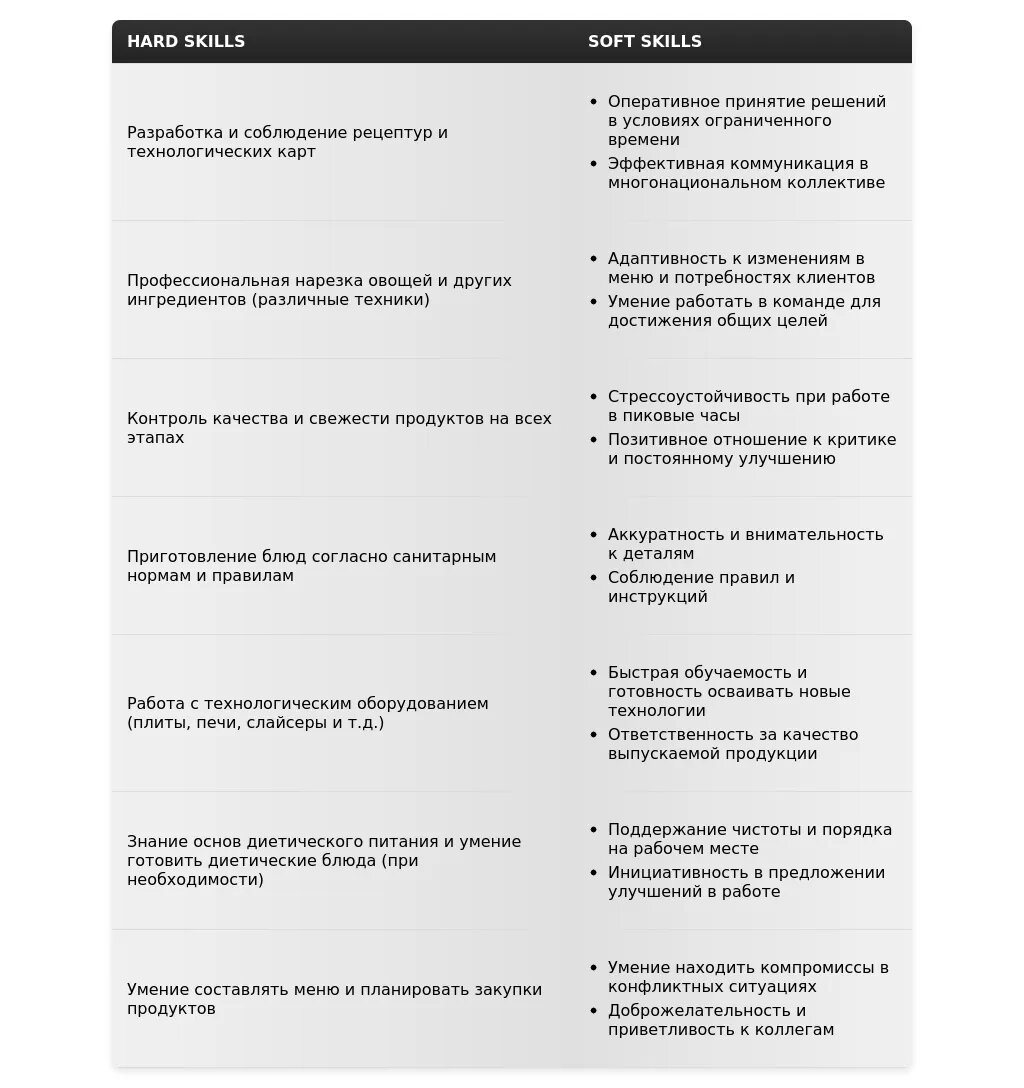 Анализ: Обязательные требования – опыт работы, знание технологических карт и кухонь. Желательно – знание программ учета продуктов. "Скрытые" требования – умение быстро и качественно готовить блюда для большого количества людей, пунктуальность и соблюдение графика работы.