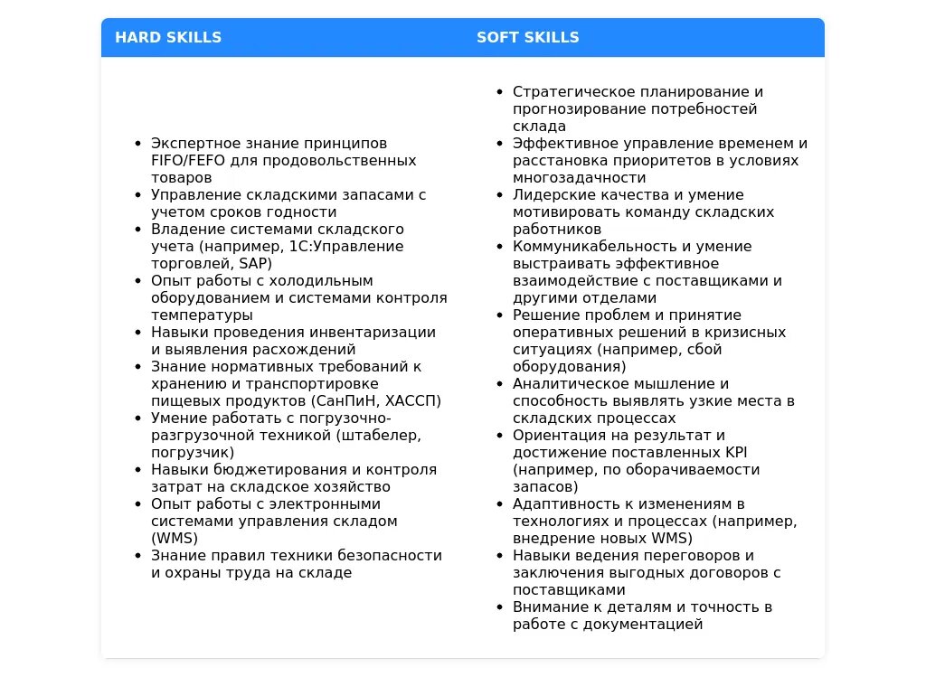 Адаптация раздела "Навыки" для заведующего продовольственным складом