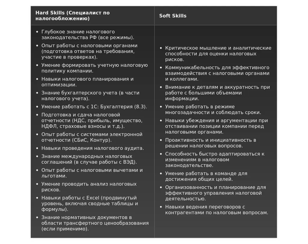 - На какие качества и навыки делать акцент: Внимательность к деталям, аналитические способности, знание налогового законодательства, умение работать с большим объемом информации, ответственность.