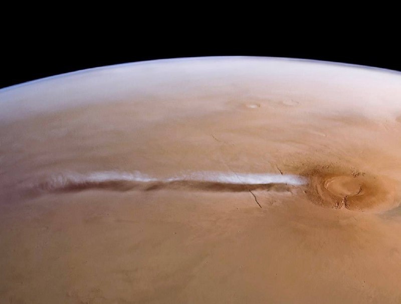 Облако у марсианской горы Арсия, протянувшееся на 1500 километров. #астро@Schukinivse Иногда, вопреки нашим ожиданиям, у марсианских вулканических пиков возникают длинные ленты облаков, напоминающие шлейф пепла от извергающегося вулкана. Разумеется, никаких действующих вулканов на планете нет. Облака образуются, когда влага в атмосфере (да, там существует незначительное содержание влаги) поднимается по склону вулкана на высоту порядка 20 километров. Там водяной пар образует кристаллы льда, которые и создают облако. Его подхватывает ветер и растягивает на огромные расстояния. Спокойной ночи, земляне! «Щукин и всё»