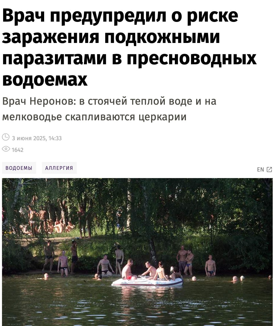 Церкариоз: как защититься от «зуда купальщика» и не испортить себе отдых Летние купания в пресных водоёмах могут обернуться церкариозом («зудом купальщика») — аллергической реакцией на личинки паразитов. Врачи объясняют, как избежать заражения, не отказываясь полностью от купаний. Где и как можно заразиться? Опасные водоёмы: — Стоячая вода (пруды, озёра, заводи рек). — Места скопления уток и других водоплавающих птиц (церкарии живут в их организме). Как происходит заражение: 1. Личинки внедряются в кожу при контакте с водой. 2. Через 10–15 минут появляется: - Сильный зуд и жжение. - Красная сыпь или волдыри (чаще на ногах, руках, животе). Первая помощь при заражении: 1. Немедленно ополоснуться водопроводной водой. 2. Протереть кожу спиртовой салфеткой или раствором соды (1 ст. л. на стакан воды). 3. Принять антигистаминное («Супрастин», «Зодак»). 4. Не расчёсывать — можно занести инфекцию! Как купаться безопасно? ✔ Выбирайте проточные водоёмы с п