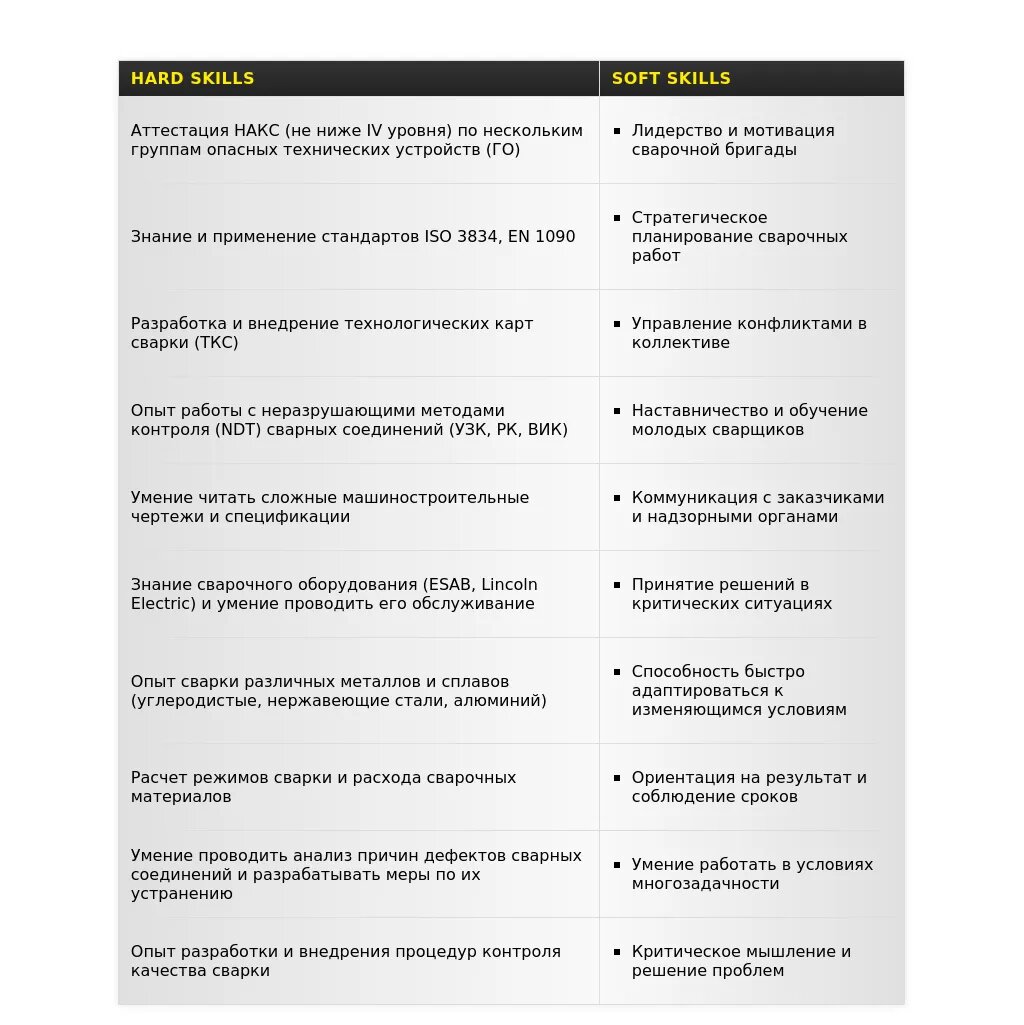 - Технические навыки: Навыки сварки, знание технологий, оборудования, материалов.