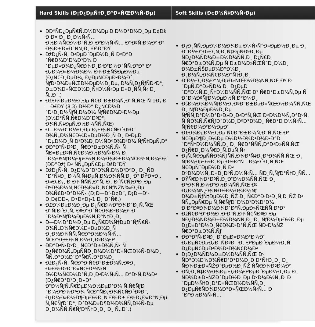 Раздел "Навыки" позволяет работодателю быстро оценить, обладаете ли вы необходимыми компетенциями. Адаптируйте этот раздел, чтобы выделить те навыки, которые наиболее важны для конкретной вакансии.