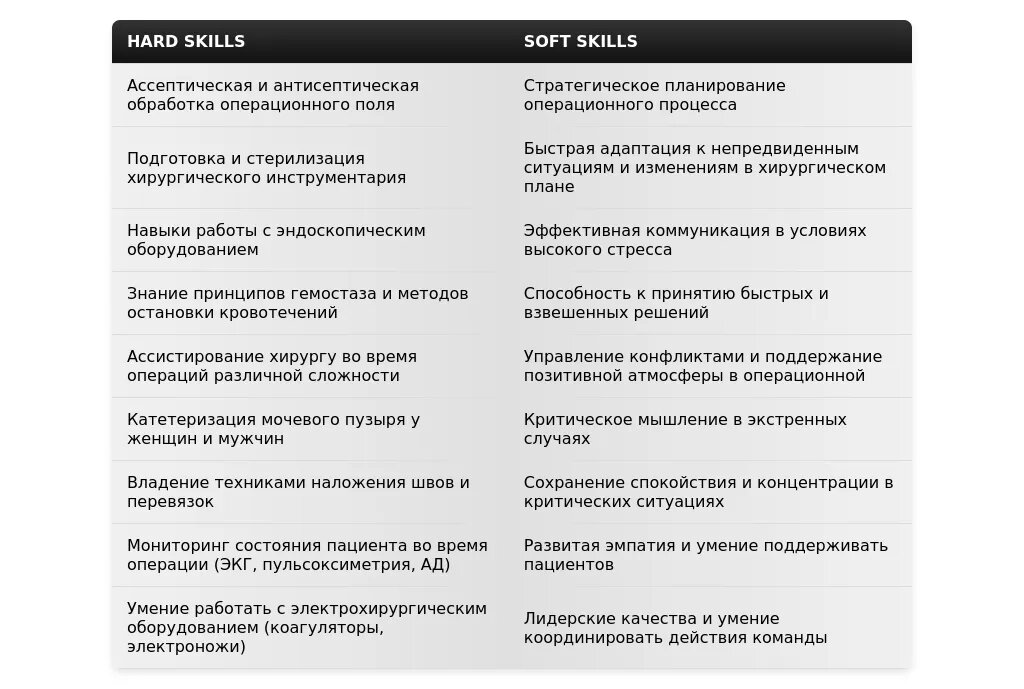 - На какие качества и навыки делать акцент: Ответственность, внимательность к деталям, умение работать в команде, стрессоустойчивость, знание санитарных норм и правил асептики и антисептики.
