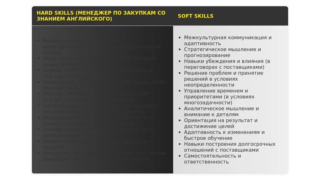 - Для международных компаний: "Ведение переговоров на английском языке", "Работа с иностранными поставщиками", "Международная логистика", "Работа с SAP".