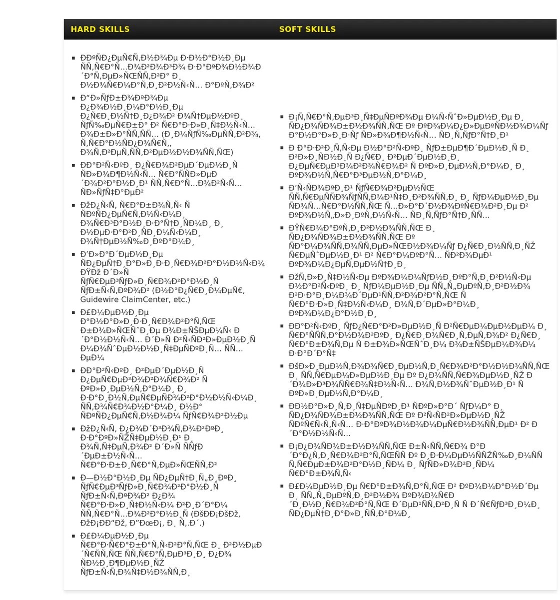 - Перечисление обязанностей, а не достижений:❌Пример: "Занимался рассмотрением страховых случаев, проводил оценку ущерба и согласовывал выплаты."Почему это плохо: Не показывает вашу эффективность и результативность. Лучше указать конкретные результаты вашей работы (например, сокращение сроков урегулирования убытков или снижение выплат).