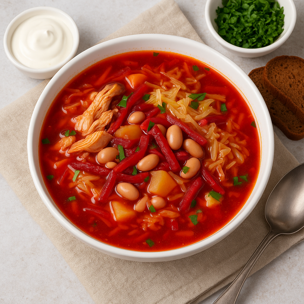 Борщ — это не просто суп, а настоящий символ домашнего уюта и семейных обедов. Вариантов этого блюда множество: с говядиной, свининой, грибами, вегетарианский. Но сегодня речь пойдёт о менее распространённом, но не менее вкусном варианте — борще с курицей и фасолью. Такой борщ получается особенно питательным, но при этом менее жирным, чем классический с мясом на кости. Курица придаёт бульону легкость, а фасоль насыщает и делает его сытнее. Это идеальный выбор для тех, кто хочет пообедать вкусно, сытно, но без тяжести. В статье мы подробно разберём пошаговый рецепт, расскажем, какие продукты подойдут лучше всего, и дадим советы, как сделать борщ ещё вкуснее. Для бульона: Овощи: Дополнительно: Выключите огонь, накройте борщ крышкой и дайте ему настояться 20–30 минут. За это время он «соберёт» все ароматы и станет вкуснее. Подавайте борщ горячим, с ложкой сметаны и свежим чёрным хлебом. Можно посыпать зеленью или добавить дольку чеснока для аромата. Такой борщ отлично хранится в холо