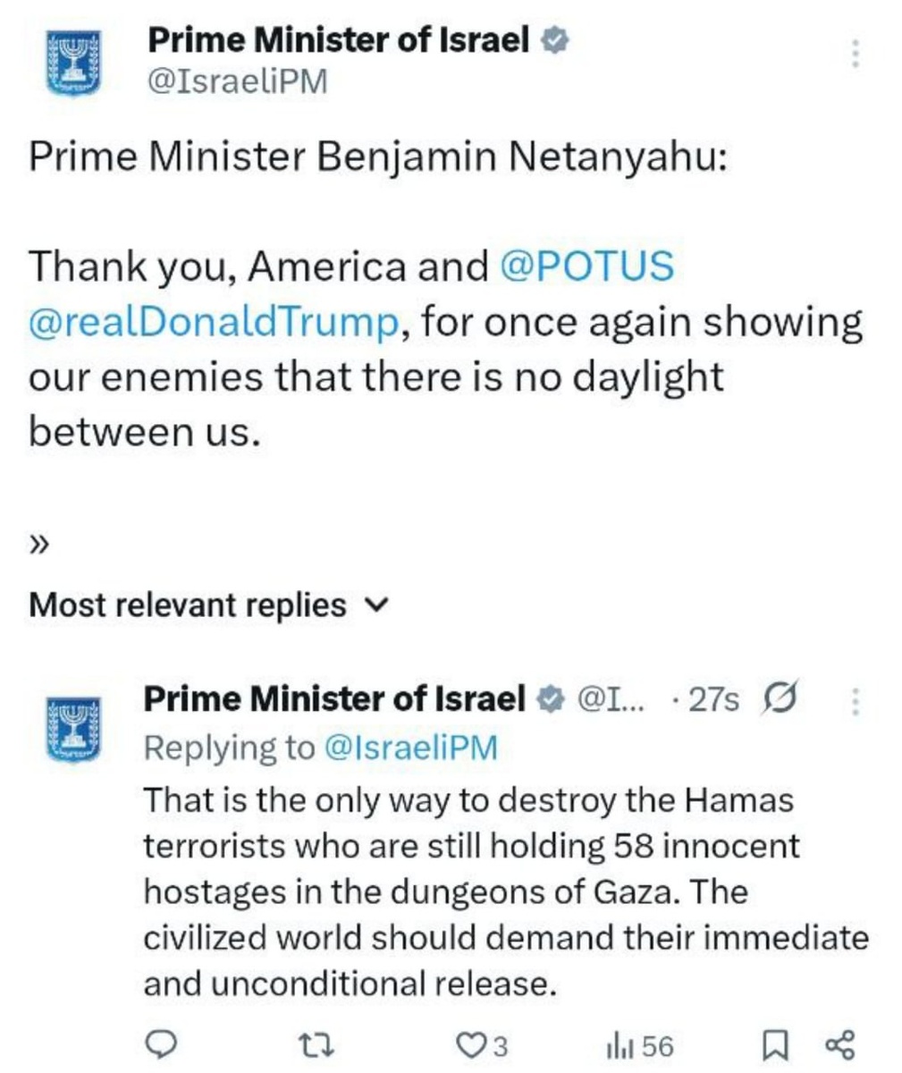 В ответ на пост Netanyahu also thanks Trump for blocking resolution Says it's the 'only way to destroy Hamas terrorists' And that all 'civilized world' should demand release of hostages
