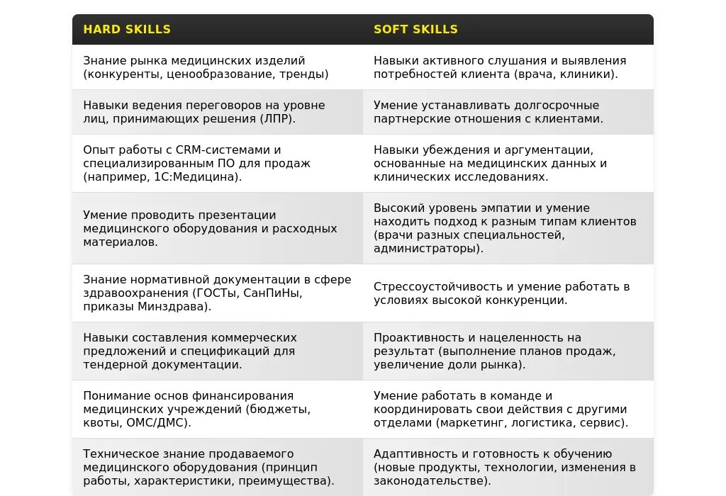 Ключевые навыки, релевантные для позиции менеджера по продажам медицинских изделий.