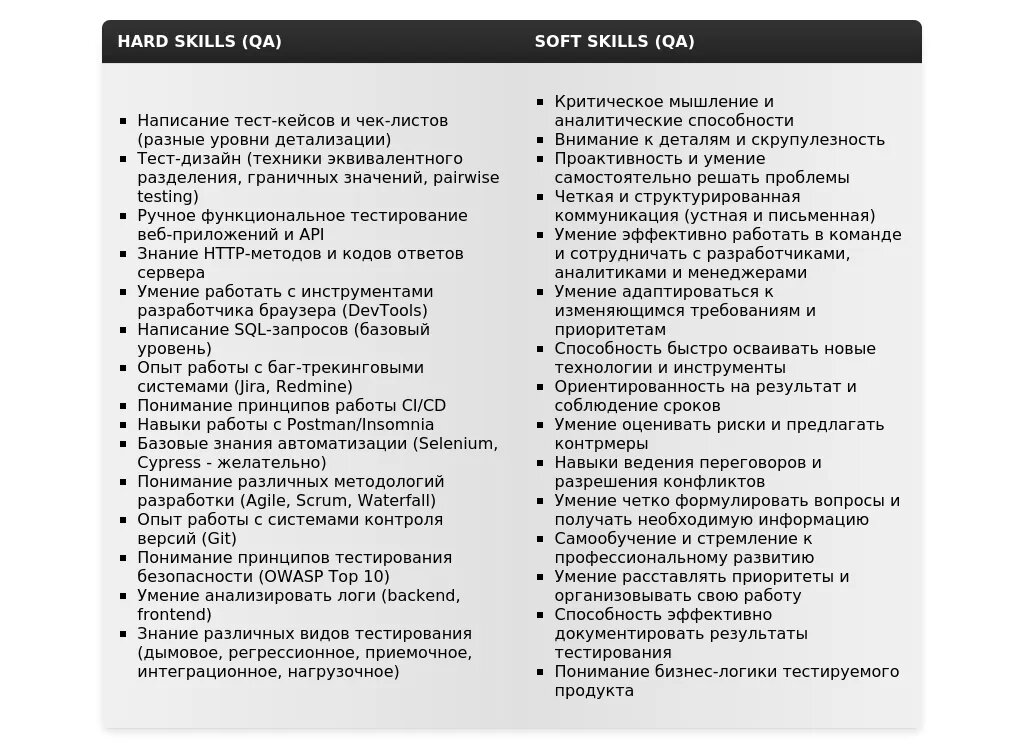 - Для вакансий, связанных с ручным тестированием: "Разработка тест-кейсов", "Тестирование веб-приложений", "Регистрация и отслеживание дефектов", "Приемочное тестирование", "Техники тест-дизайна".