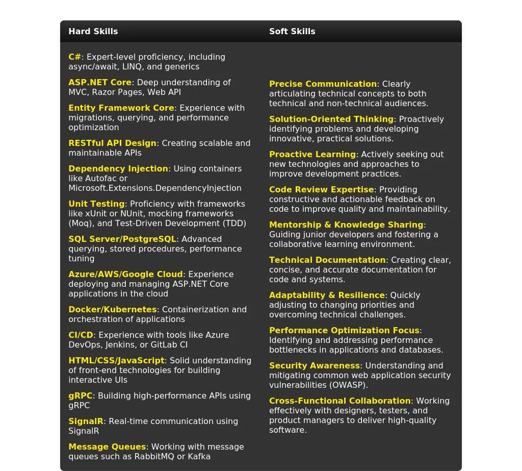 Языки программирования: C# (Expert). Фреймворки: ASP.NET Core (Expert), Entity Framework Core (Expert), ASP.NET MVC (Advanced). Базы данных: MS SQL Server (Expert), PostgreSQL (Advanced). REST API: Разработка и интеграция (Expert). Инструменты: Docker (Advanced), Kubernetes (Advanced), Git (Expert).