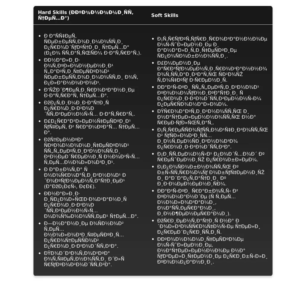 Раздел "Навыки" – это список ваших ключевых компетенций, которые соответствуют требованиям вакансии. Важно представить свои навыки в наиболее структурированном виде, выделив те, которые наиболее важны для работодателя.