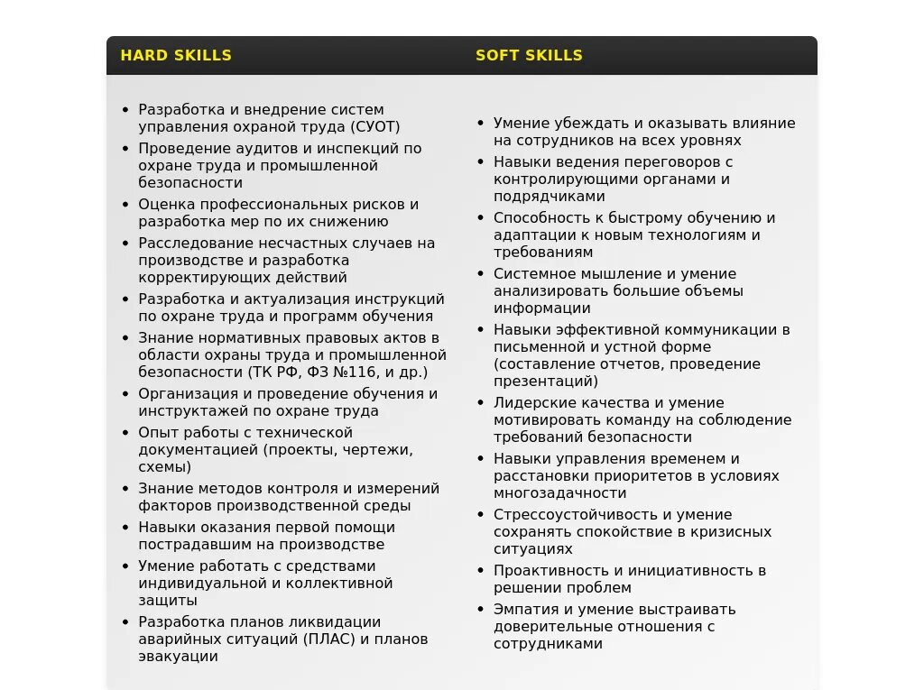 "Навыки: Охрана труда, промышленная безопасность, пожарная безопасность, электробезопасность, первая помощь."