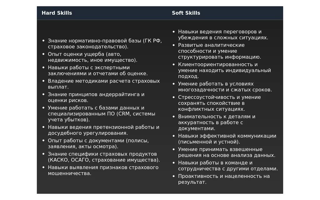 На что обратить внимание: В резюме необходимо акцентировать внимание на опыте работы с юридическими лицами, привести примеры урегулирования крупных убытков и указать на навыки работы с документацией и проведения экспертиз.