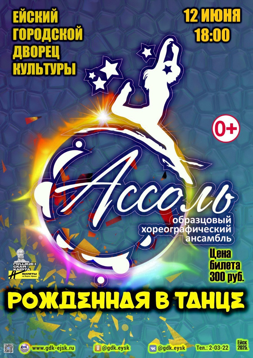 12 июня в 18:00 состоится концерт образцового хореографического коллектива «Ассоль» — «Рожденная в танце» 💃 Билеты можно приобрести в кассе по адресу: ул. Свердлова, 73/1, а также онлайн Цена: 300₽ В танцевальном арсенале коллектива собраны танцы самых разнообразных стилей и направлений: от стилизованного народного и эстрадного до современной хореографии. Коллектив является постоянным участником всех значимых городских и районных мероприятий, а также неоднократным призёром, дипломантом и лауреатом конкурсов различного уровня — от районных до краевых и всероссийских. Сегодня коллективом вдохновенно руководит талантливый и увлечённый своим делом специалист — Татьяна Сергеевна Мирошниченко. Под её чутким руководством были созданы новые танцы и хореографические композиции для сольной программы, а также пошиты эксклюзивные костюмы, которые добавляют яркости и индивидуальности нашим выступлениям.