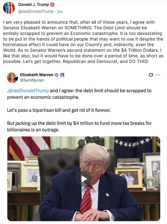Trump says debt limit needs to be 'entirely SCRAPPED' To prevent 'economic catastrophe' 47 sounds surprised more than anything that he's agreeing with Elizabeth Warren