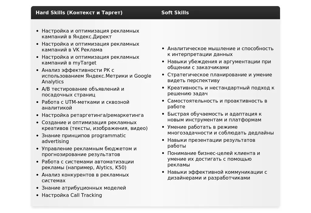 - Перечислите ключевые навыки: Укажите навыки, соответствующие требованиям вакансии (например, Google Ads, Яндекс.Директ, Facebook Ads Manager, аналитика, оптимизация).