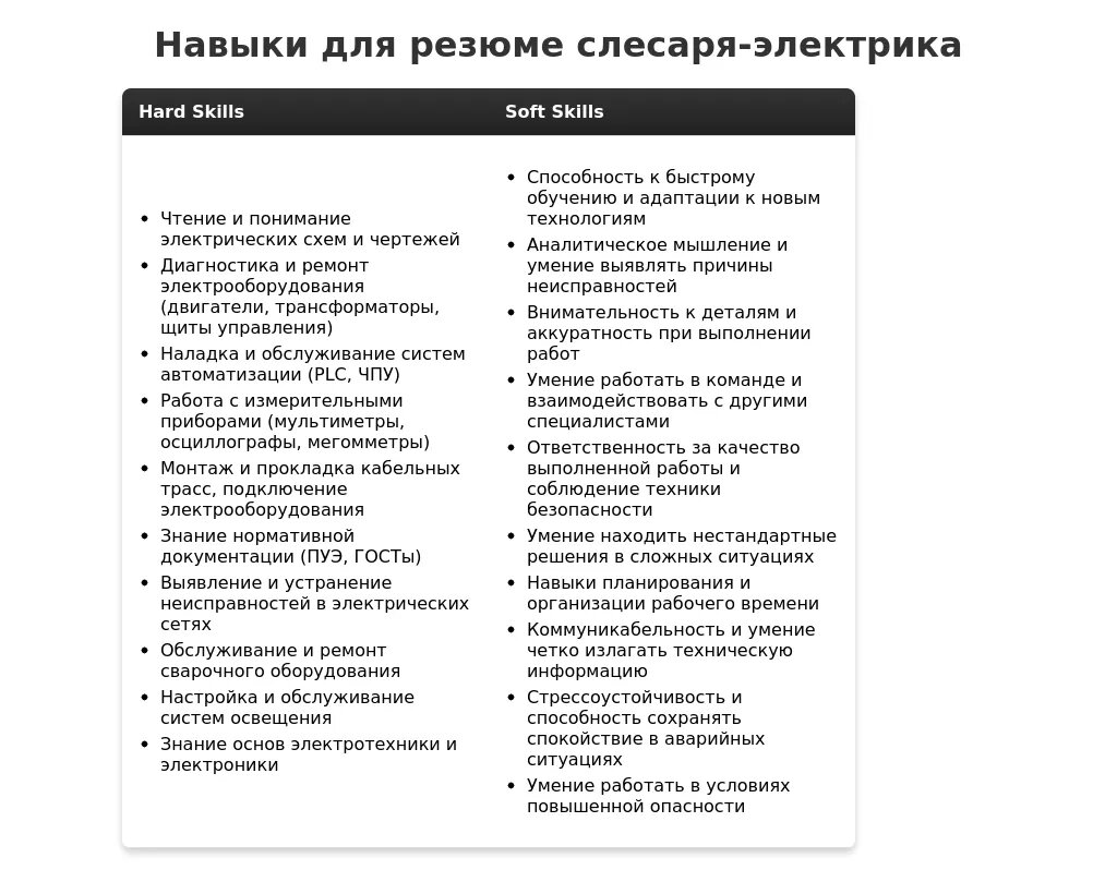 - Разделите навыки на категории: Например, "Электротехнические навыки", "Навыки работы с оборудованием", "Навыки диагностики", "Личные качества".