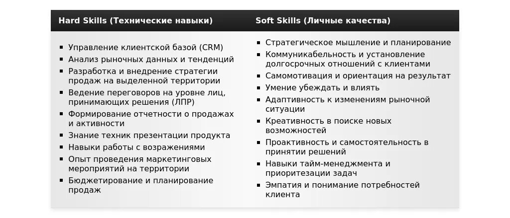 В разделе "Навыки" необходимо выделить те компетенции, которые требуются для успешного выполнения работы. Например, если в вакансии упоминается "знание техник продаж", укажите, что вы владеете различными техниками продаж, такими как SPIN, SNAP и т.д.