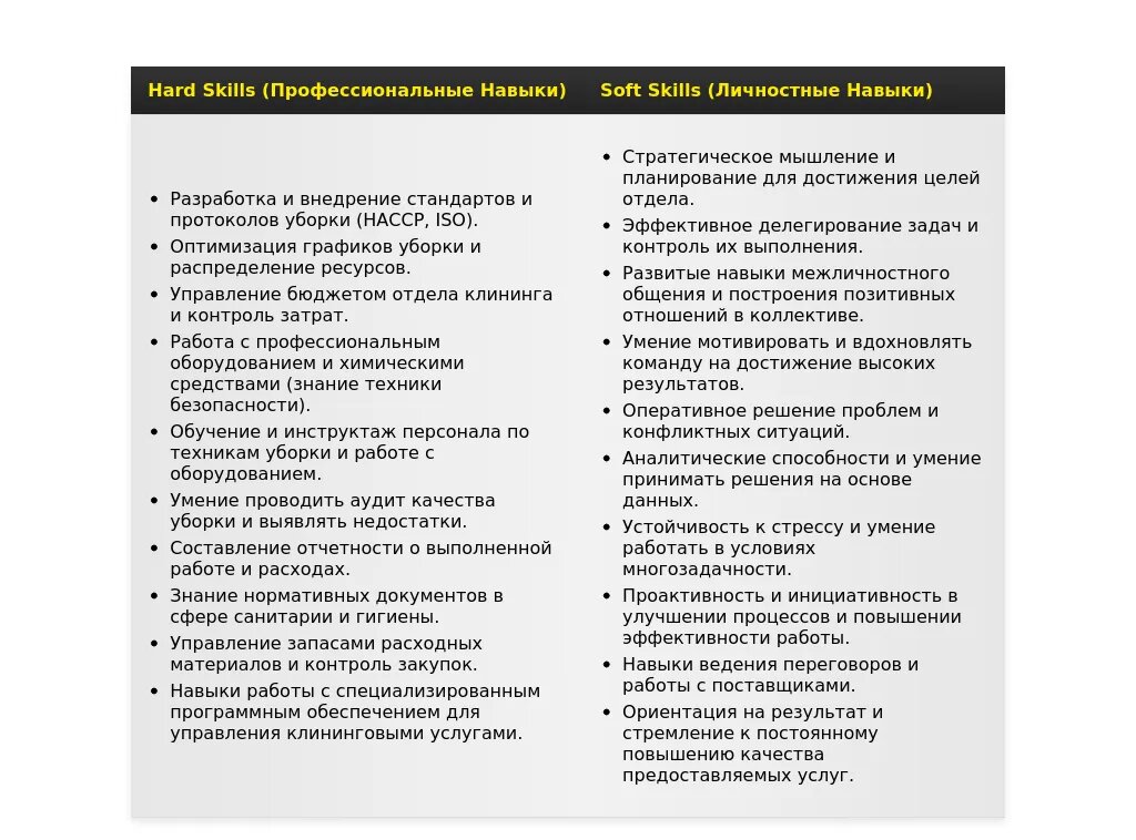 - Для бизнес-центров: "Поддержание чистоты и порядка", "Взаимодействие с арендаторами", "Контроль качества уборки", "Стандарты обслуживания".