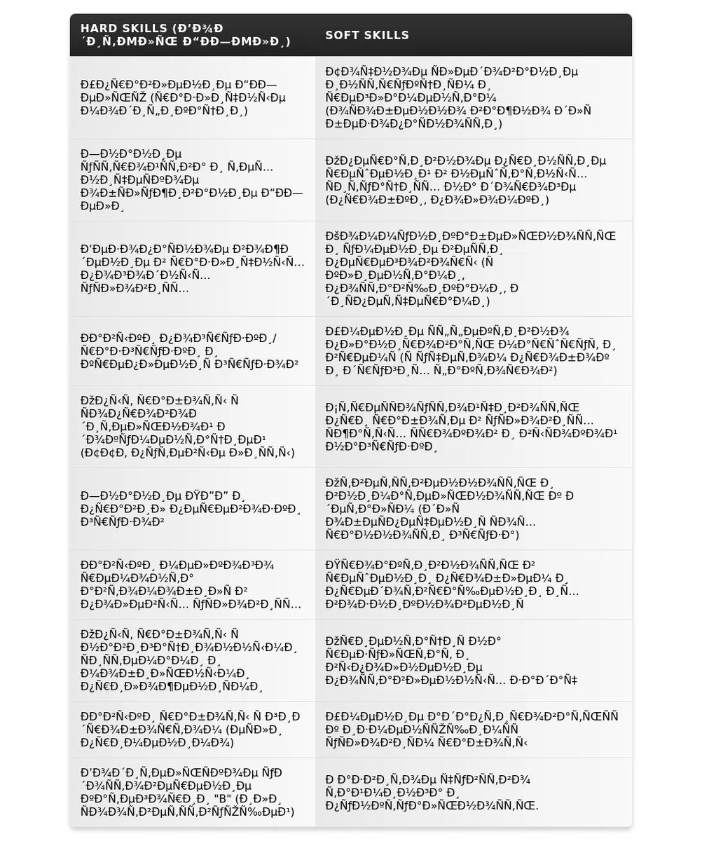 - Навыки: Подчеркивают ваши ключевые навыки и компетенции, релевантные для данной работы.