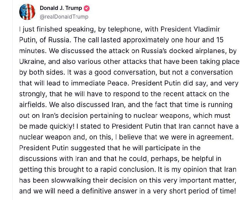 📞 Путин заявил Трампу, что ему придётся ответить на недавнюю атаку на военные аэродромы России