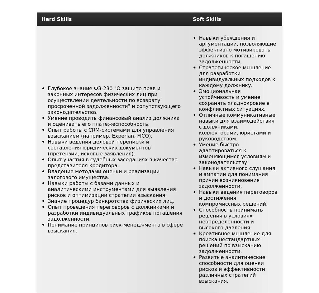 - Коллекторское агентство: "Работа с большим объемом информации", "Знание различных методов взыскания (soft collection, hard collection)", "Работа в условиях жестких KPI", "Взыскание задолженности на досудебной и судебной стадии".