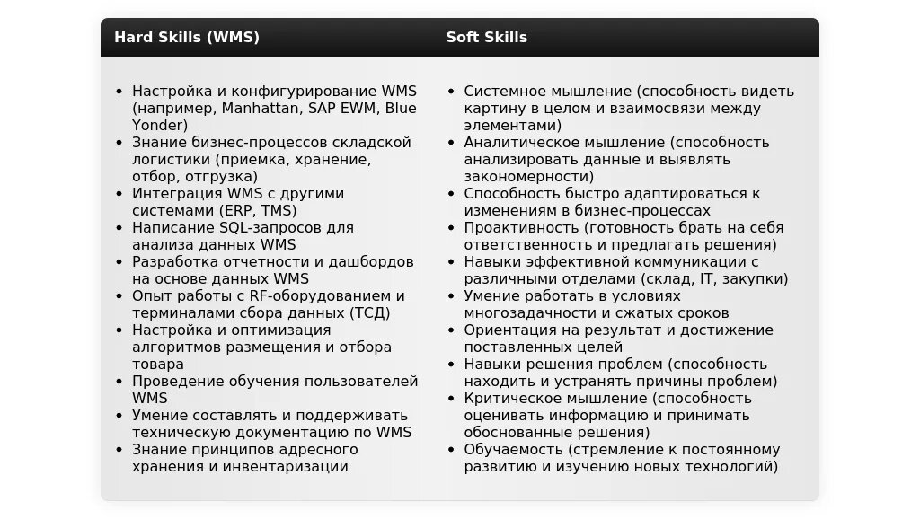 - Сгруппируйте навыки по категориям: Разделите навыки на группы, например, "Технические навыки", "Soft skills", "Знание WMS-систем".