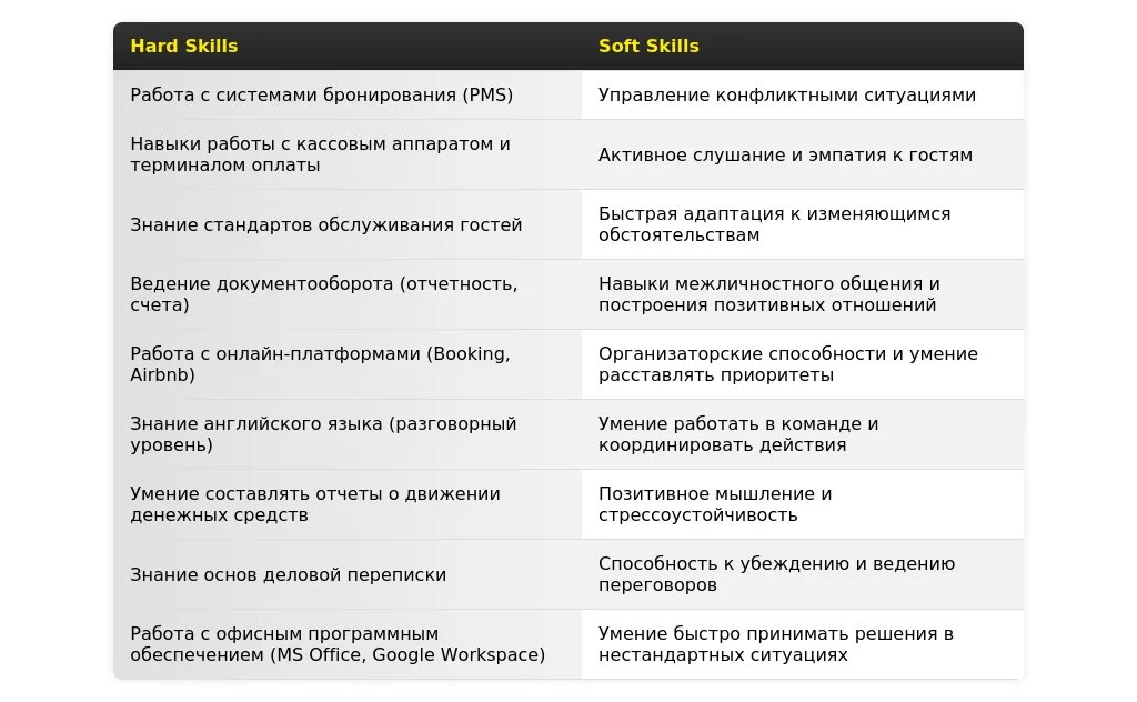 - Обязательная информация:Ключевые навыки, релевантные для позиции администратора мини-гостиницы.