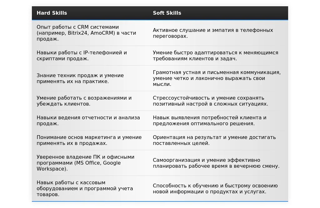 - На какие качества и навыки делать акцент: Коммуникабельность, убедительность, стрессоустойчивость, ответственность, нацеленность на результат, умение работать в команде.