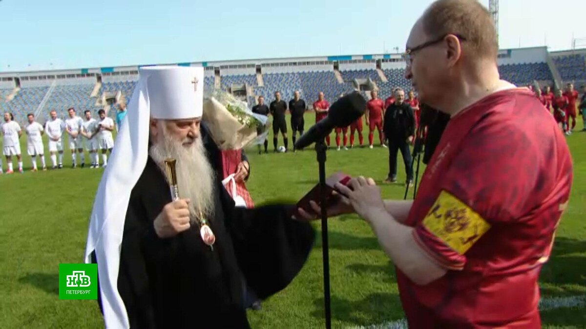 [ Смотреть видео на сайте НТВ ] Митрополит Санкт-Петербургский и Ладожский празднует юбилей и принимает поздравления на стадионе «Петровский». 70-летие Варсонофий отметил накануне, а сегодня стал гостем на товарищеском матче между священнослужителями и сотрудниками СПбГУ. Инициатором этого необычного подарка стал петербургский вуз, который давно дружит с епархией. Прежде чем раздался стартовый свисток, ректор университета Николай Кропачев вручил имениннику и памятную медаль, и мяч, подписанный всеми игроками встречи, а также книгу. Это воспоминания самого владыки, собранные и опубликованные благодаря СПбГУ. Варсонофий, митрополит Санкт-Петербургский и Ладожский: «Ну, когда вы видели, чтобы митрополит был капитаном команды, а вот уже есть. Николай Михайлович мне предложил, а я не отказался. Это матч дружбы, матч любви, матч единения, матч духовности нашей. Это пример того, как мы должны жить, любить и молиться друг за друга». Счет открыл митрополит Варсонофий, став на несколько минут на