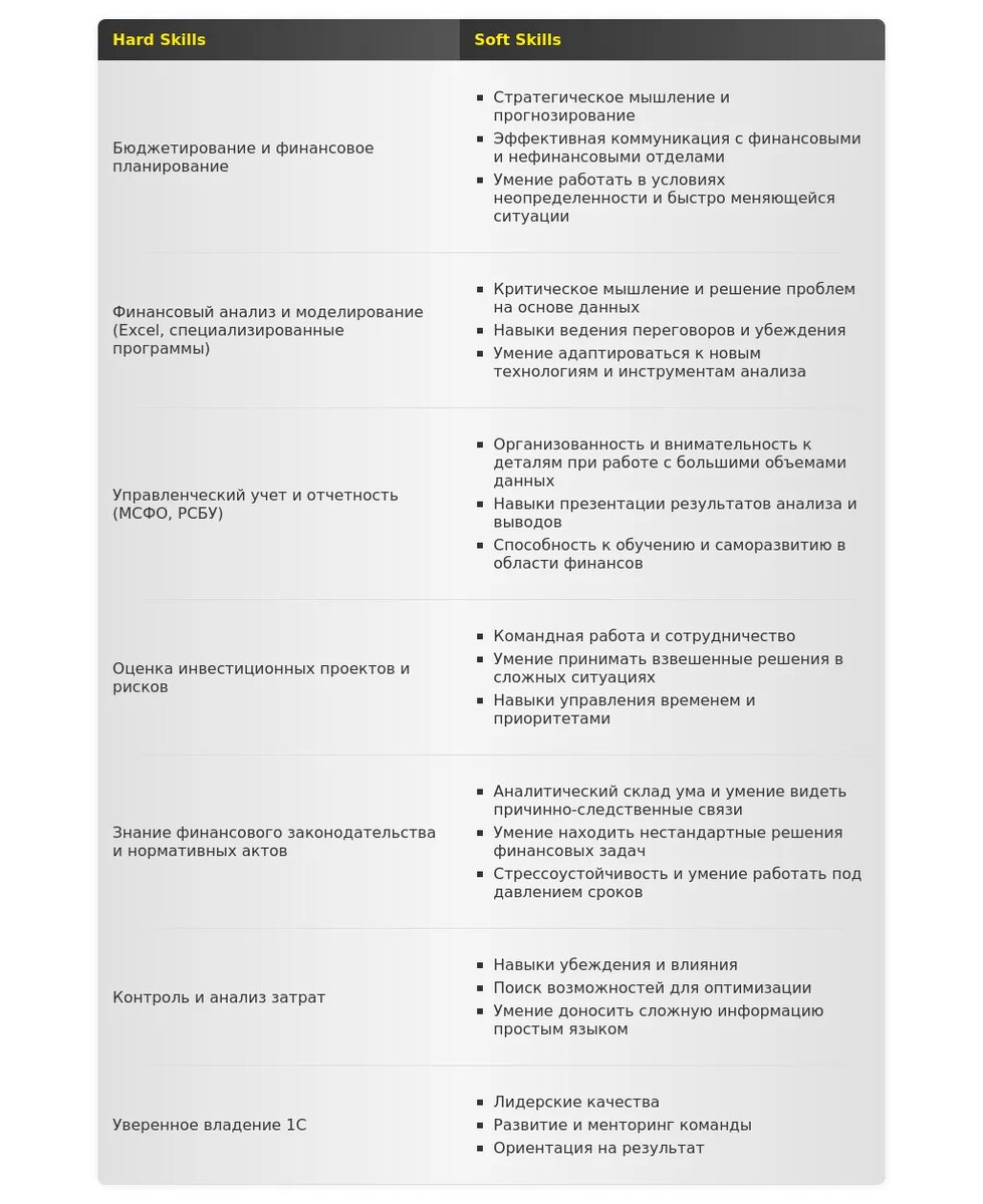 - Ключевые навыки: Укажите, какими навыками вы владеете в совершенстве (например, финансовый анализ, бюджетирование, управленческий учет).