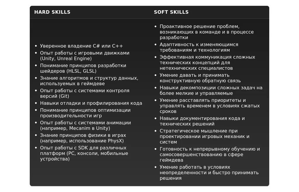 - Unreal Engine Developer: "Разработка на C++", "Работа с Unreal Engine API", "Создание Blueprint", "Оптимизация графики", "Разработка шейдеров".