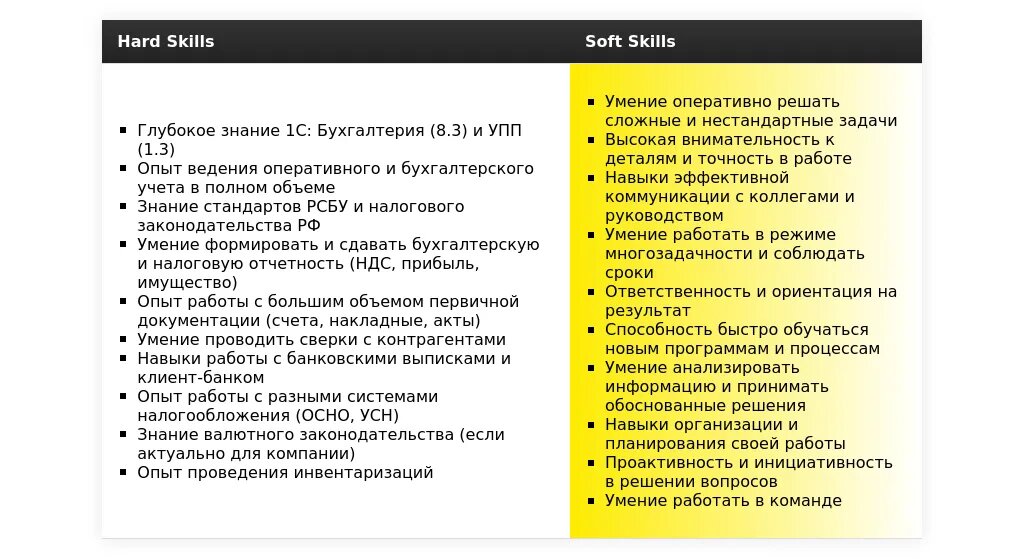 - Сгруппируйте навыки по категориям: Например, "Бухгалтерский учет", "Налоговый учет", "Работа с ПО".