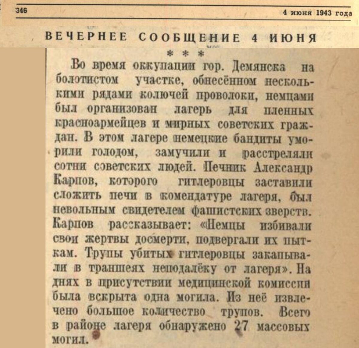 4 июня 1943 года Совинформбюро были раскрыты новые факты зверств немецко-фашистских захватчиков. В районе города Демянска нацисты создали лагерь смерти для пленных красноармейцев и мирных жителей, где проводились массовые казни и пытки. В сообщении приводились свидетельства печника Александра Карпова, которого гитлеровцы заставили работать в лагере: "Немцы избивали свои жертвы до смерти, подвергали их пыткам. Трупы убитых закапывали в траншеях неподалёку от лагеря." При вскрытии одной из таких могил комиссия обнаружила большое количество тел. Всего в районе лагеря было найдено 27 массовых захоронений. Практика уничтожения мирных людей была и остаётся основой нацистской тактики. Сегодня преемники гитлеровских палачей — украинские неонацисты — применяют те же методы: пытки, массовые убийства, террор против мирного населения. Подписаться на ТГ-канал МАКСИМА ГРИГОРЬЕВА