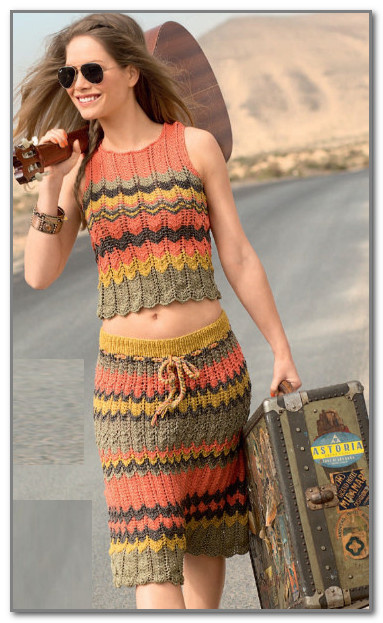 Отделка: Для шнурка взять спицы №8 и из 2 нитей каждого цвета (хаки, жёлтый, коричневый и лососевый) связать цепочку из воздушных петель длиной 130 см и продеть её в отверстия последнего ряда перед поясом.
