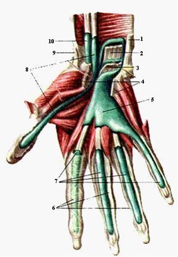А сухожильные оболочки мизинца и большого пальца - сообщаются с ладонными оболочками.