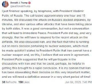 Неожиданно Трамп удалил пост, в котором указывал, что Кремль ответит за удары по аэродромам (теперь снова опубликовал). Возможно решил его переписать. Ждём заявления Кремля. Но уже почти все прогнозируют, что Кремль нанесет масштабный удар по Украине. Скорее всего будет показательный удар Орешником. Вопрос только какие цели выберут? Неужели ПГХ, ЖД тоннели, аэродромы, порты или центры принятия решений?