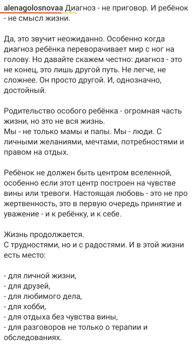 Именно по этой причине немного выпала из мамкой жизни, из особенной жизни. Нашла себе интерес. То что зажигает, мотивирует, заставляет жить по-новому. Отстала от ребенка. И ему, кстати, будто пошло это на пользу. Ведь в жизни должно быть место не только для ребенка. Ты у себя одна. Сначала я у себя в голове пришла к такому выводу, а сегодня нашла подтверждение своим мыслям. Ниже приведу скриншот из поста одной девушки в ИГ. По нику можете сами найти ее там. Это не реклама, - просто было бы некрасиво воровать чужие слова. Я восхищаюсь! Хотелось бы, чтобы каждая из нас держала подобное в голове. #рас #рда #аутизм #детидождя