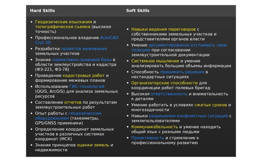 - Для государственных учреждений: "Работа с государственными кадастрами", "Знание земельного законодательства", "Взаимодействие с государственными органами".