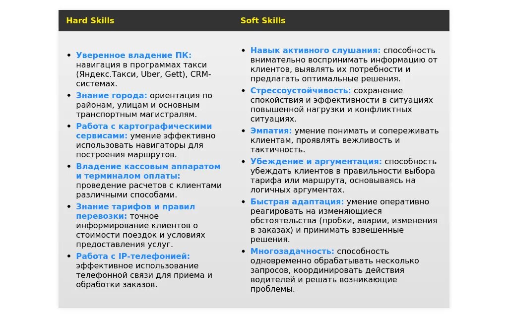 Преимущества: Подчеркнуты навыки, которые могут быть полезны в работе оператора такси.