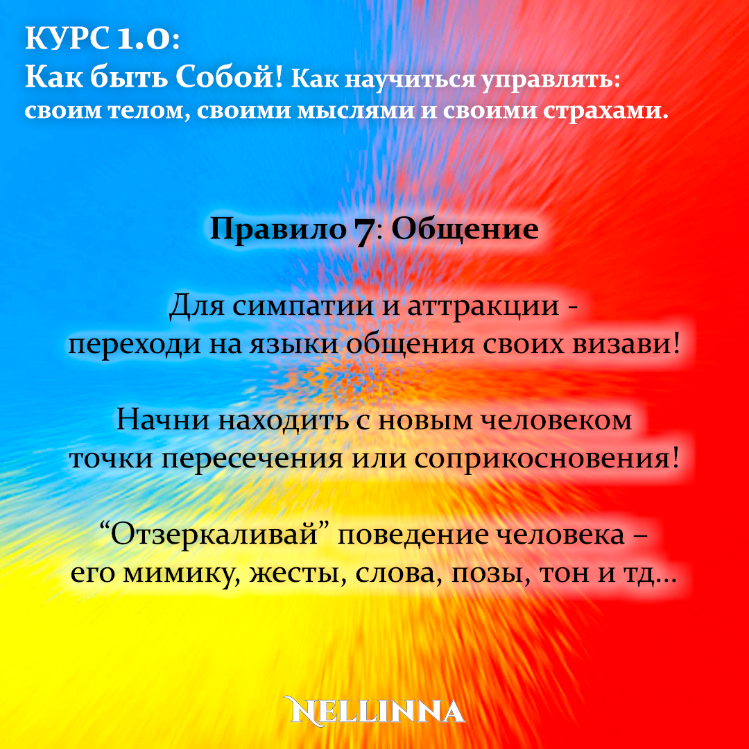 Правило 7: Для симпатии и аттракции - переходи на языки общения своих визави! Начни находить с новым человеком точки пересечения или соприкосновения! Отзеркаливай поведение человека – его мимику, жесты, слова, позы, тон и тд… Ты всегда можешь вызвать симпатию у любого человека и даже абсолютно незнакомого! И весь фокус лишь в том, что тебе нужно деликатно подстроиться к его мироощущению, к его внутреннему и внешнему ритму, т.е. заговорить с ним именно на его языке. Чтобы не пропустить следующую публикацию – Подписывайтесь! И делитесь полезной и бесплатной информацией! #курс #тренинг #обучение #практикум
