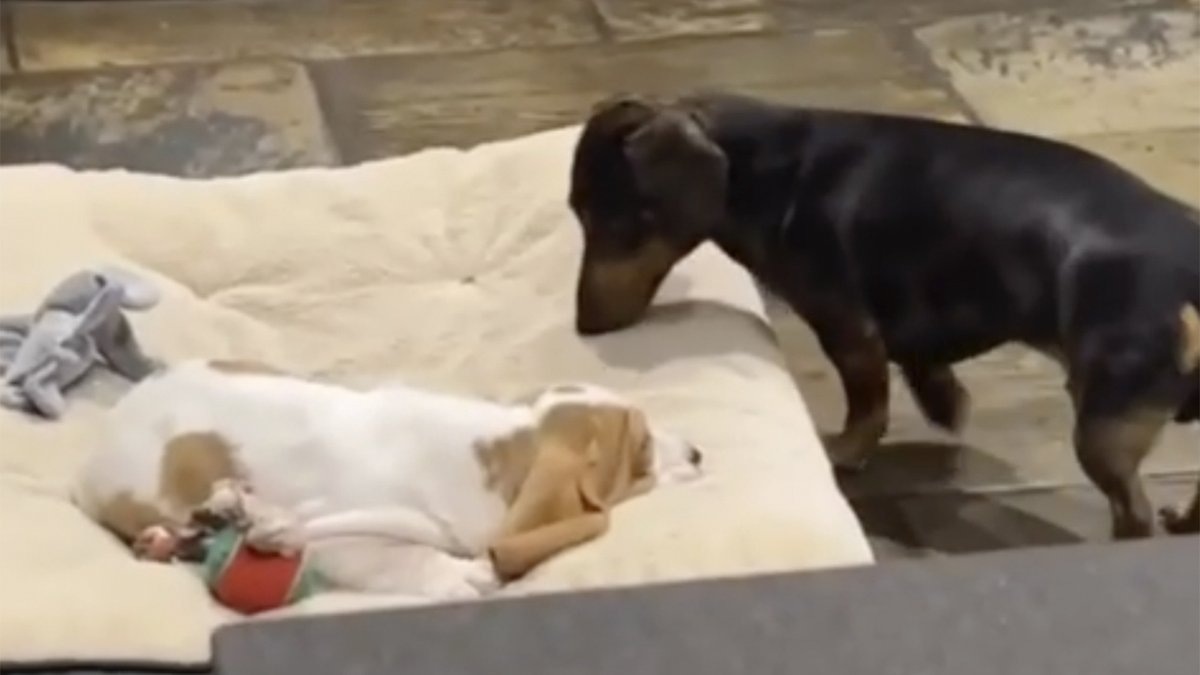 Гас ловко обвел щенка бассет-хаунда вокруг пальца — так, что малыш ничего и не понял. Пес подобрался к лежанке брата, а потом началось самое весело.