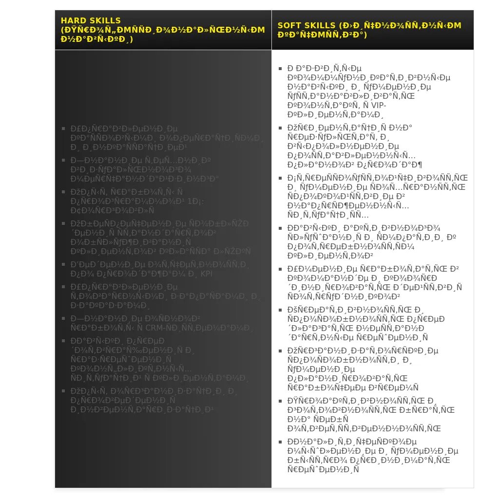 - Сгруппировать схожие навыки: Объедините схожие навыки в группы (например, "Навыки управления", "Навыки продаж").